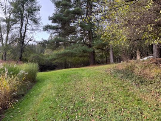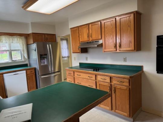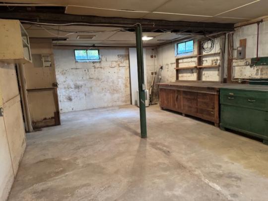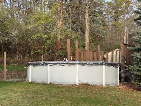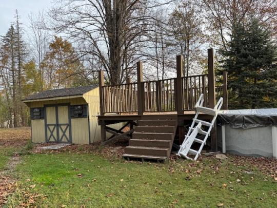 Spacious home located on .84 acres with a circular blacktop driveway. This property overlooks the Village with a wooded lot behind the home, an above-ground swimming pool and storage building. Enter this home from the front deck into the foyer with a closet. A large picture window brightens the living room with a gas fireplace and hardwood floors. The formal dining area has French doors that open onto the back deck with views of the woods and coy pond with fountains and waterfalls. The eat-in kitchen includes a refrigerator, garbage disposal, dishwasher, electric cooktop and built-in oven and leads to the mudroom and side door. On the main floor you will also find the spacious primary bedroom, a second bedroom, a full bath with heated ceramic tile flooring, a walk-in ceramic tile shower and two hall closets. Upstairs you will find 2 additional bedrooms, an office and a full bath. The full basement includes a family room with a wet bar, workshop, storage room and a door that leads to the 1 car garage.